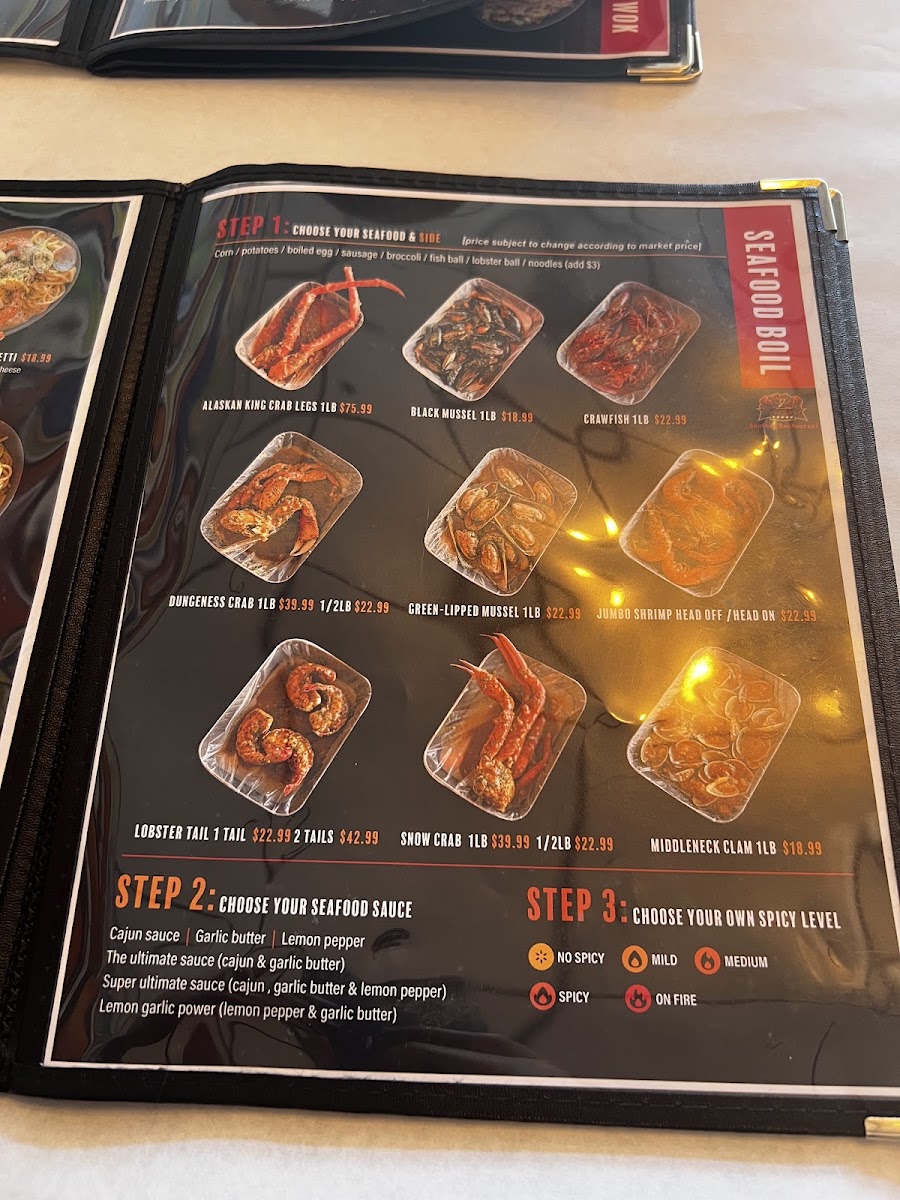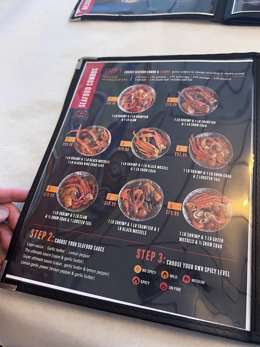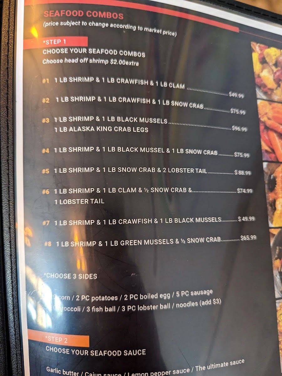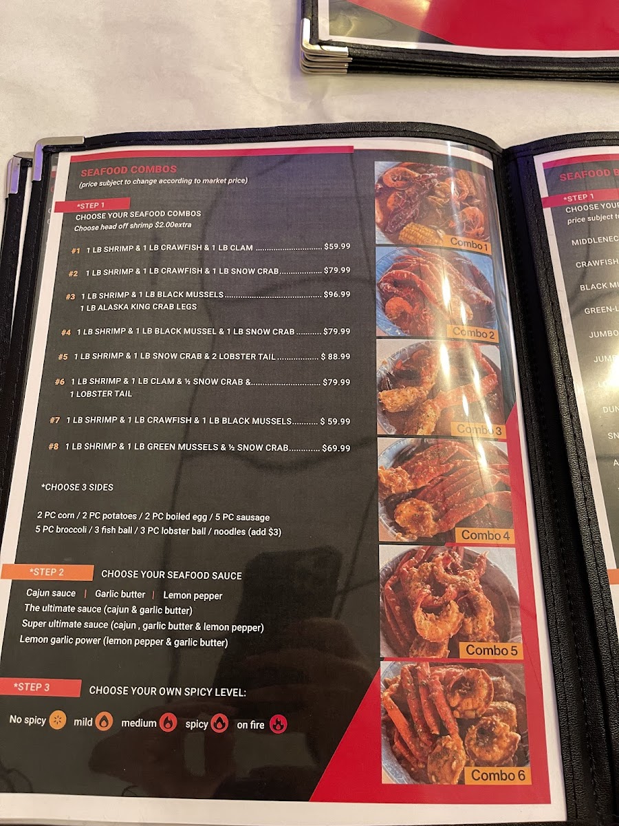 Shrimp, black mussels, snow crab with choice of 3 sides from boiled eggs, broccoli, corn, fish/lobster balls, noodle, potato, sausage, or rice. Select type of crab leg and sauce. Spicy level customizable.