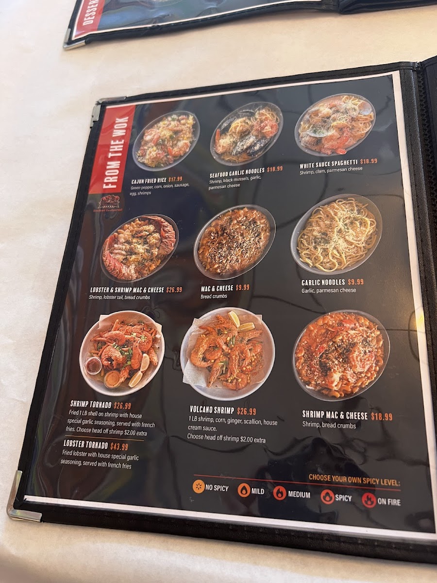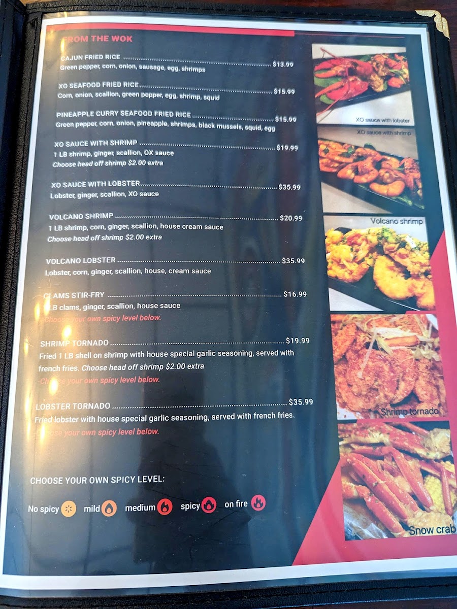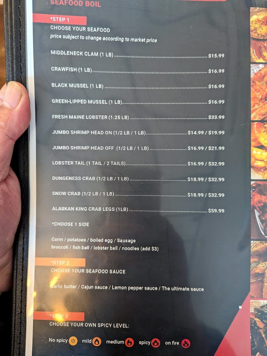 Jumbo shrimp, choose head on or off. Select from sides like boiled egg, corn, sausage, rice. Sauces include Cajun, garlic butter, lemon pepper. Spice levels from no spicy to on fire.